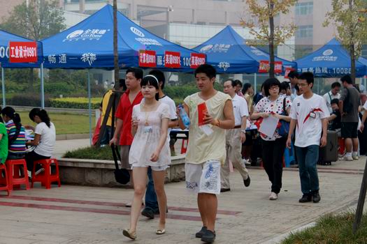 今天抵達學校的新生比昨天更多,迎新工作更忙碌,但增加的工作量并沒有減退所有迎新志願者們的積極性。在公車停靠的地方、在新生報名點、辦公室和新生寝室,随處可見志願者們的身影,他們一邊提着行李,一邊耐心地回答着新生提出的疑問。很多新生隻身一人提着行李就來到學校報到注冊,并沒有家長的陪同,充分顯示出這屆新生的獨立自主能力,仿佛剛成年了就是一個大人摸樣,可以很好地适應一個新的生活環境和學習環境。